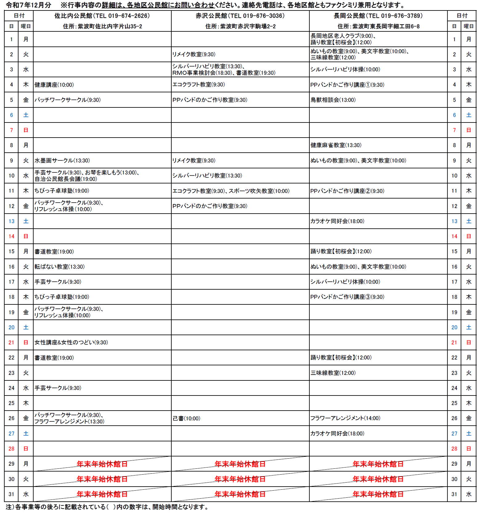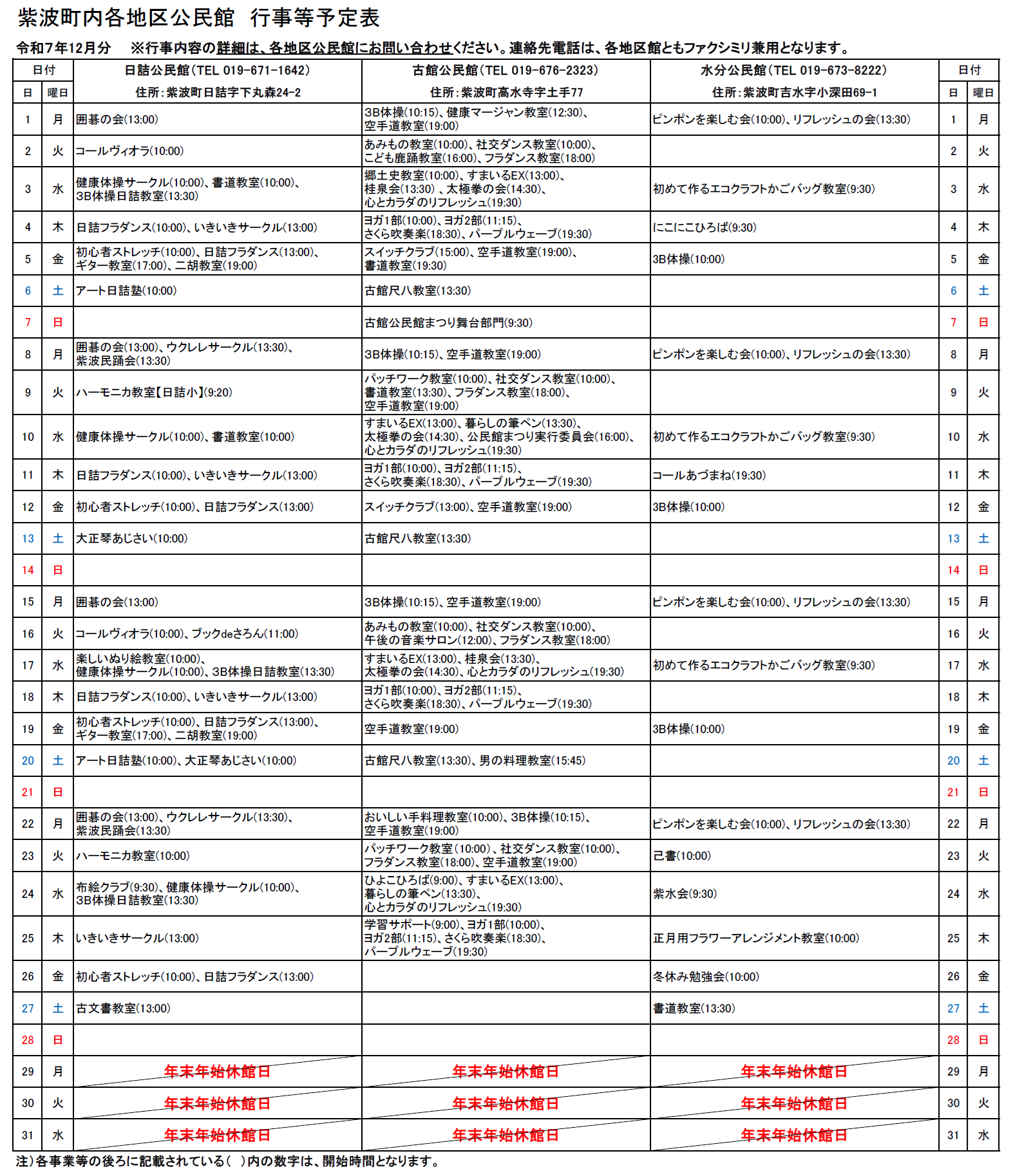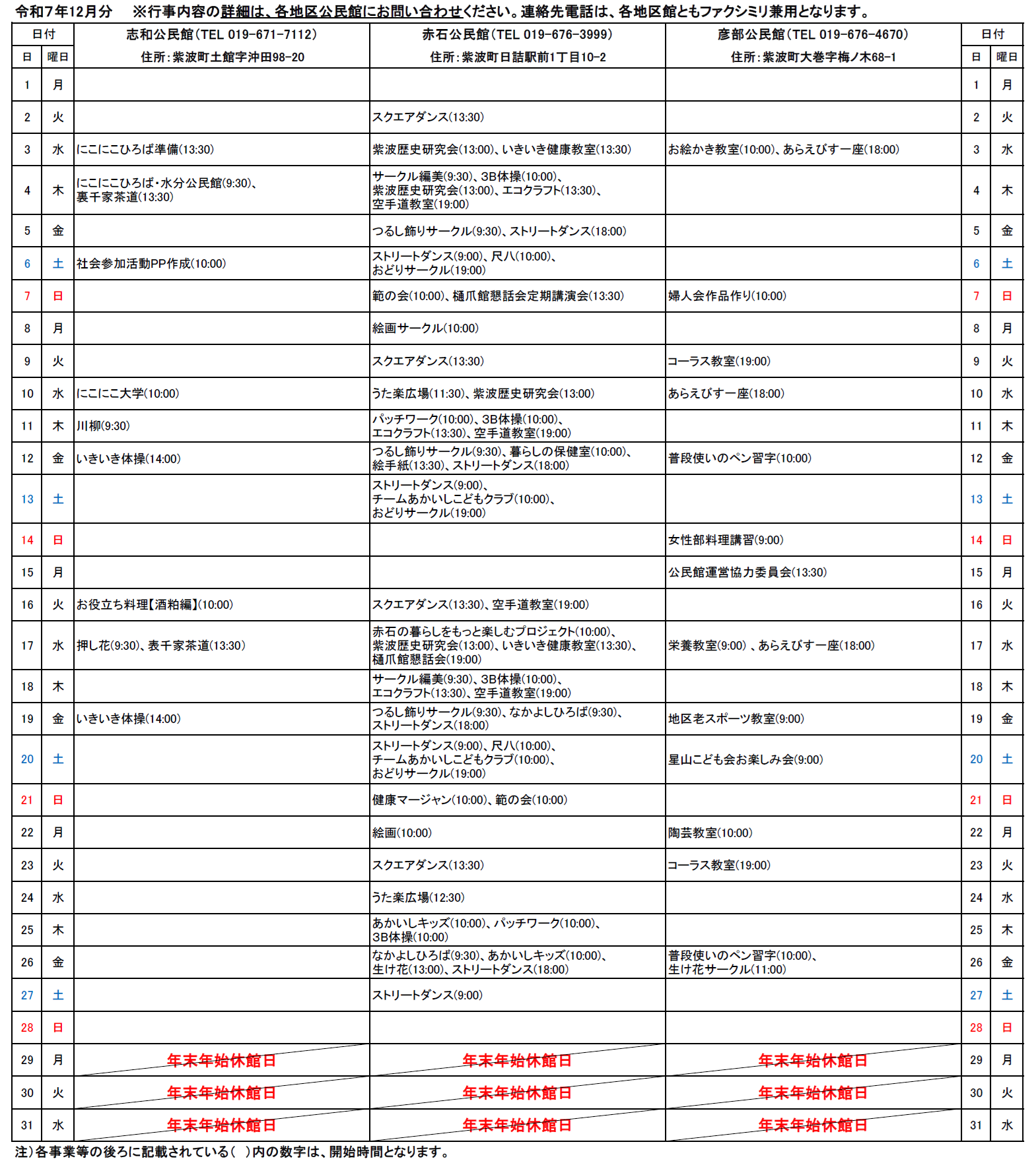 令和7年12月の町内9地区公民館の事業予定を以下のとおりお知らせします。
