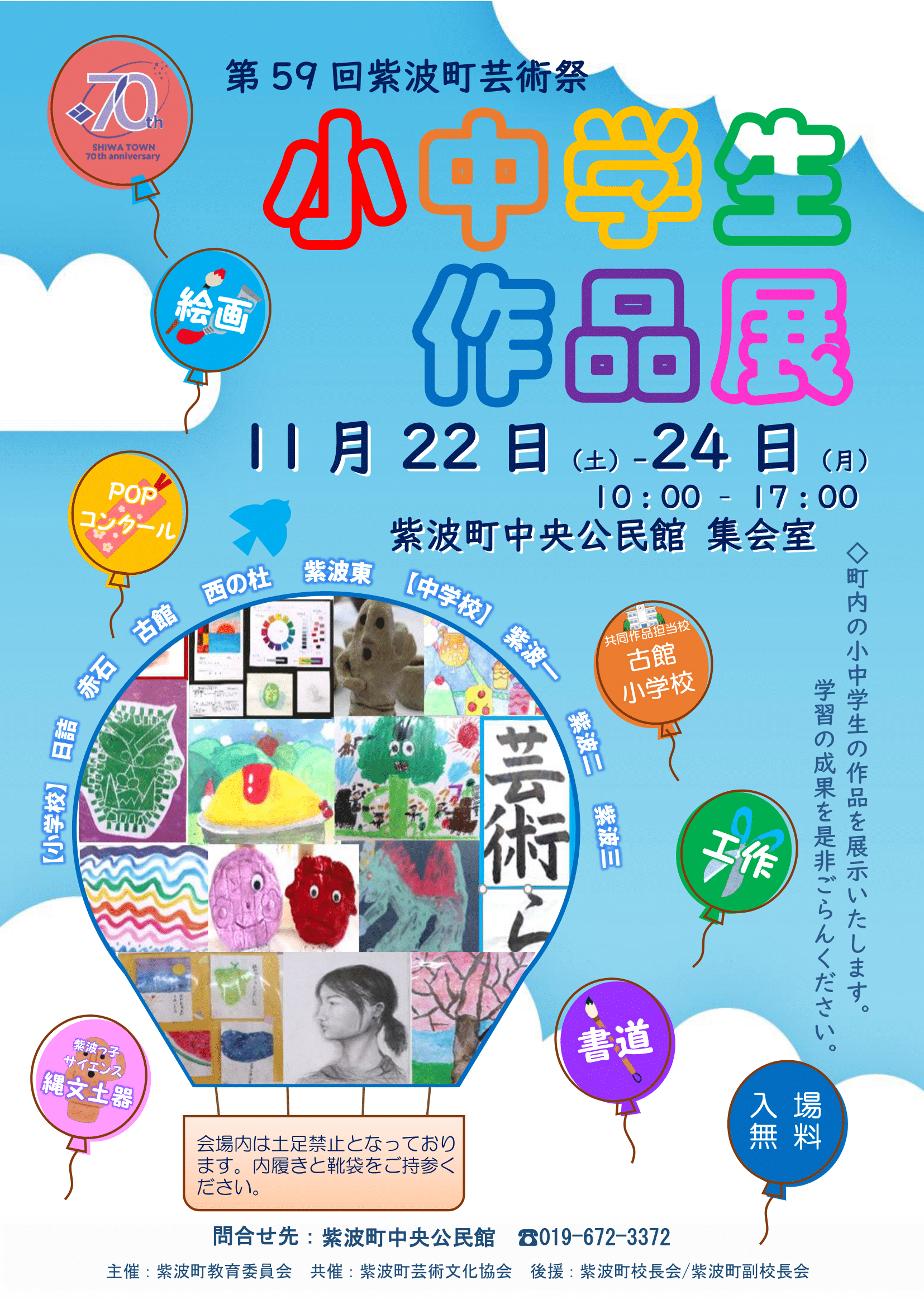 今回で59回目となる紫波町芸術祭小中学生作品展は、町内小中学校から選ばれた絵画・書写・工作を多数展示いたします。その他、古館小学校による特別出展作品、POPコンクールの入賞作品、紫波っ子サイエンス教室「縄文の科学」に参加した親子による土器も展示いたします。ご家族の皆様でのご来場をお待ちしております。