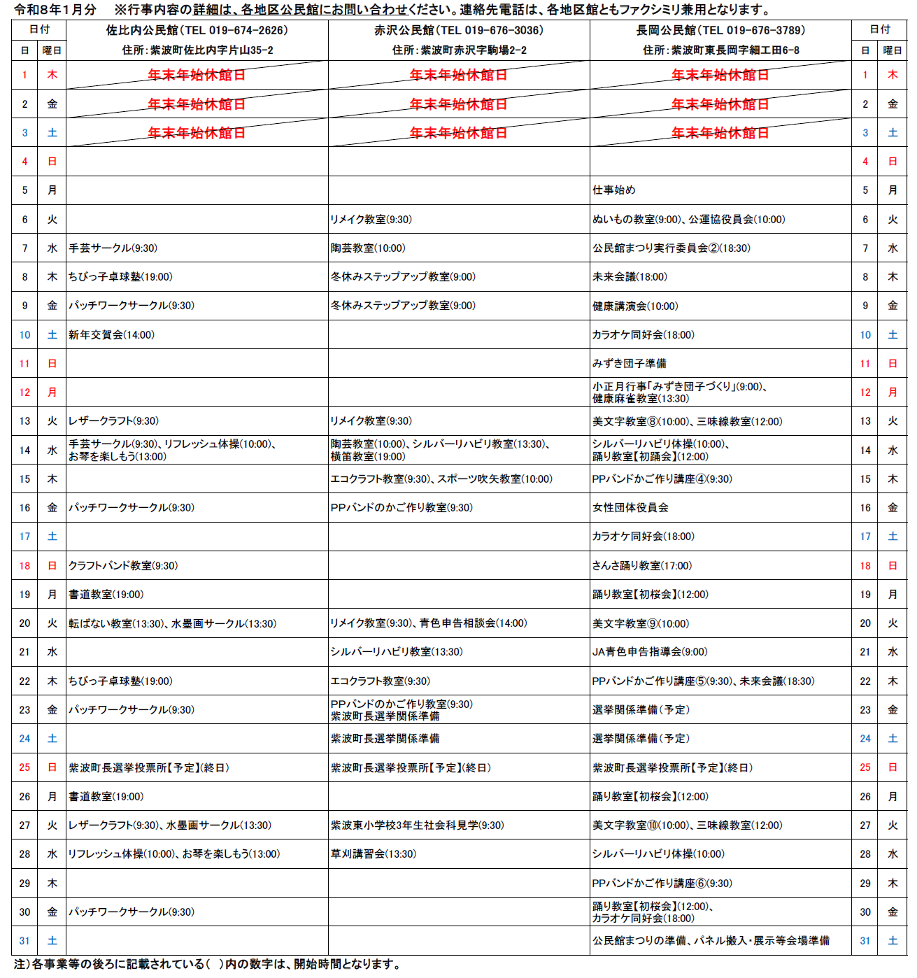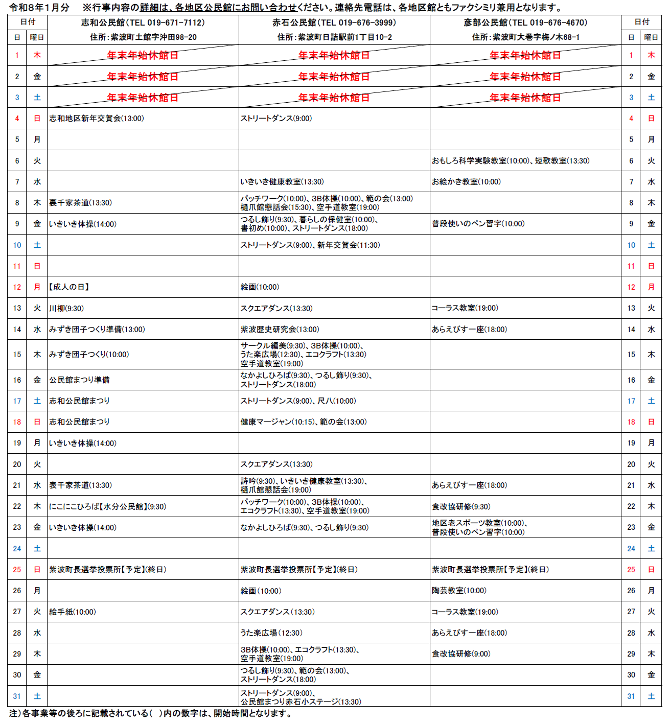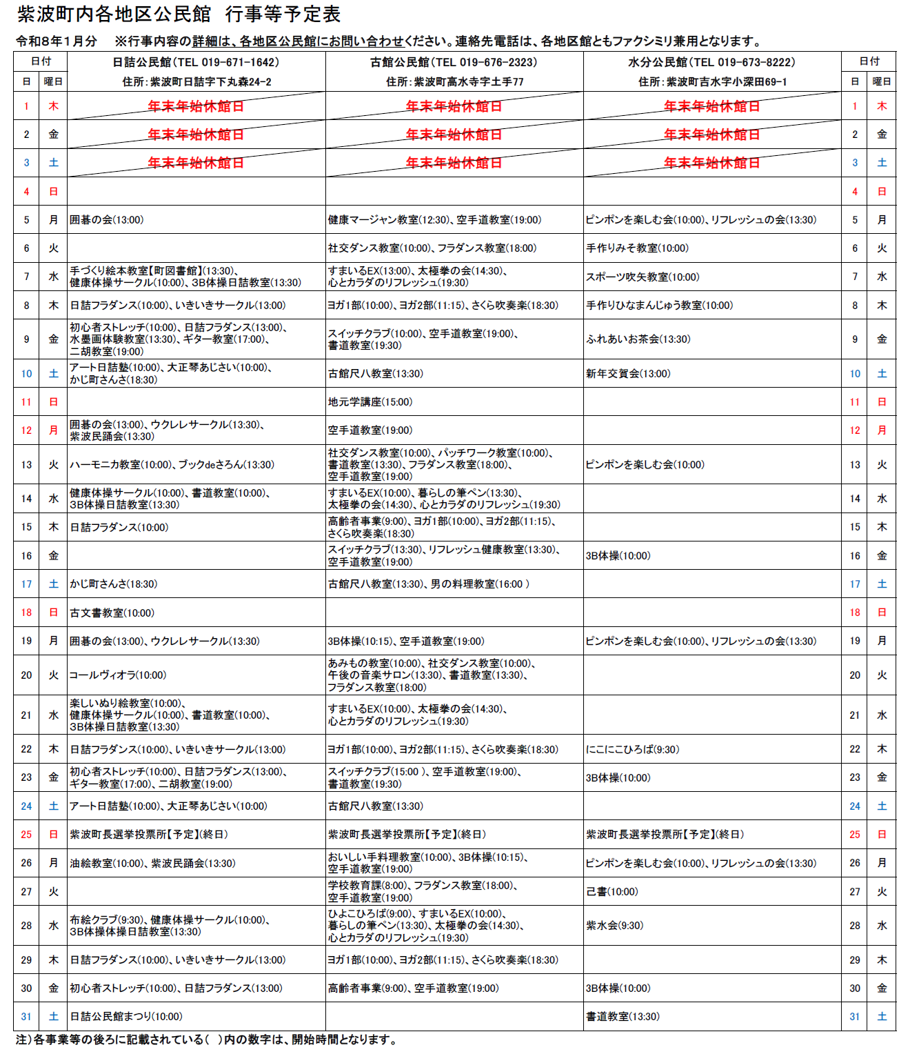 令和8年1月の町内9地区公民館の事業予定を以下のとおりお知らせします。