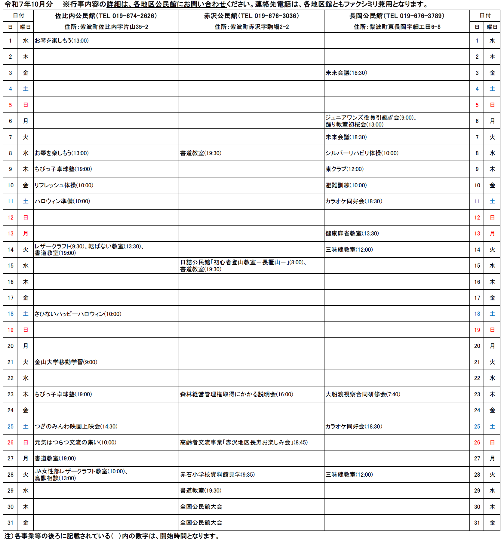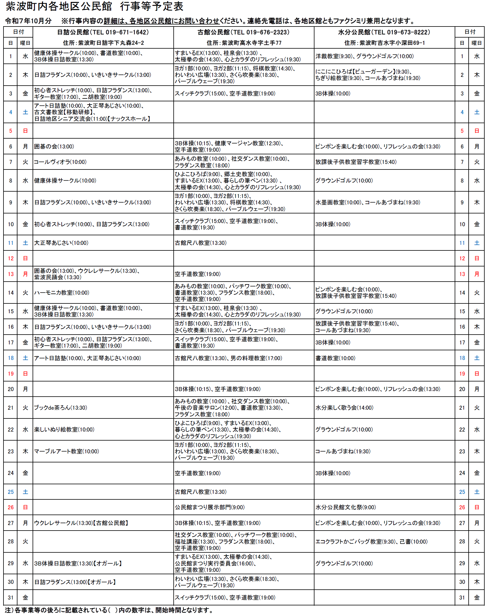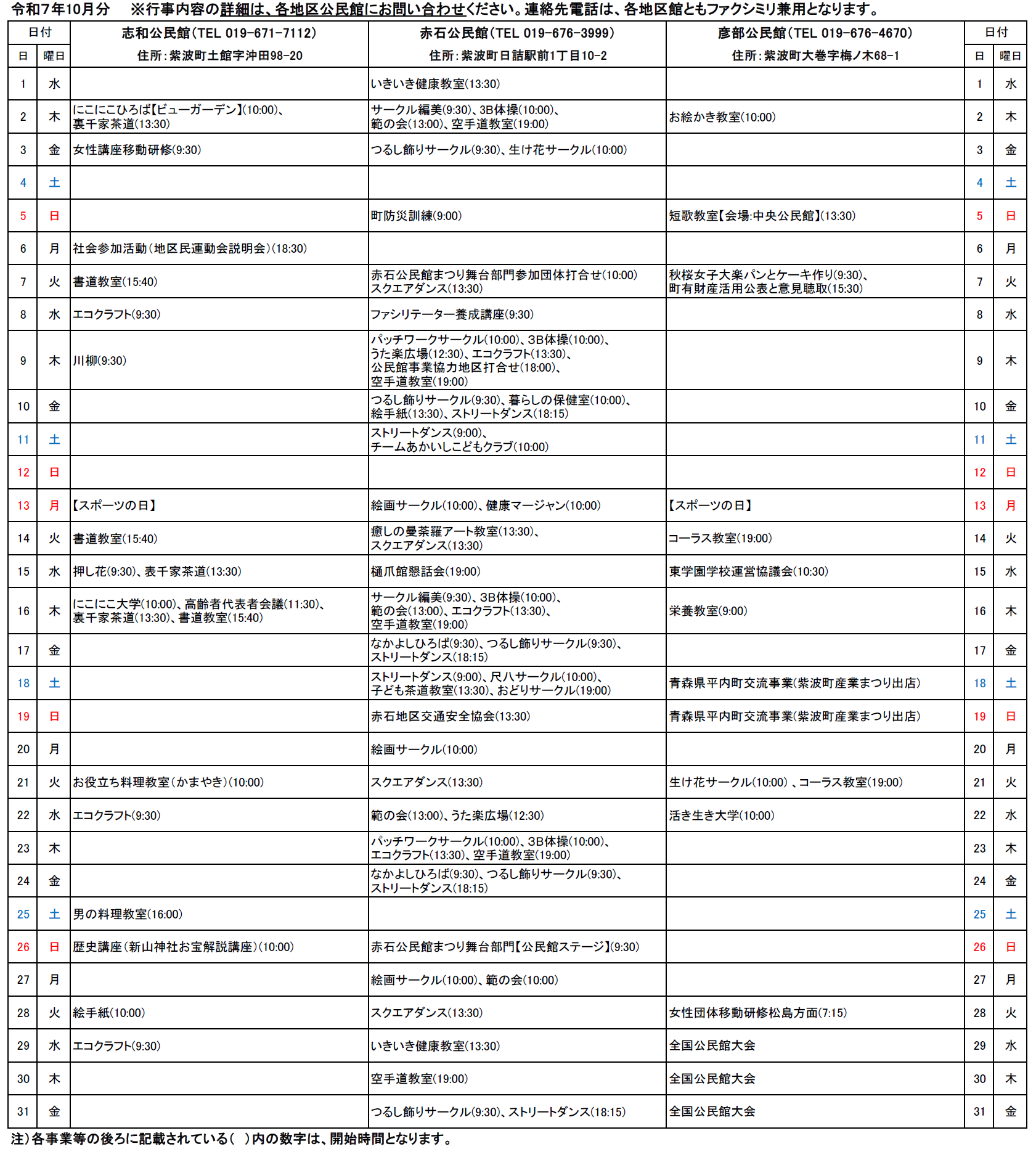 令和7年10月の町内9地区公民館事業予定を以下のとおりお知らせします。
