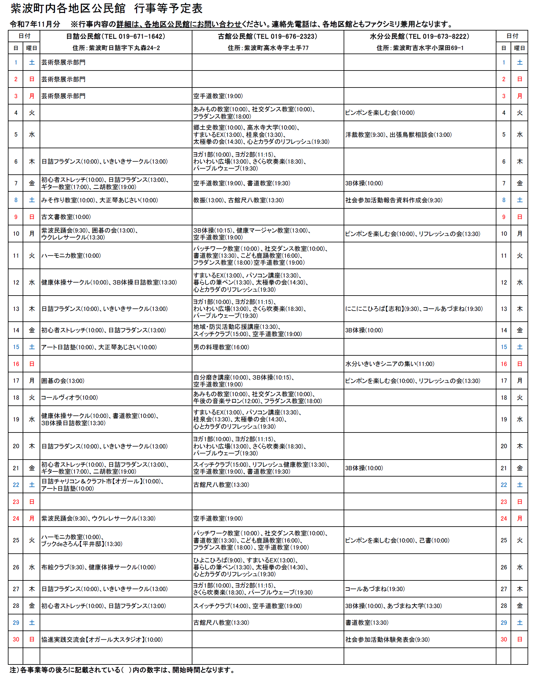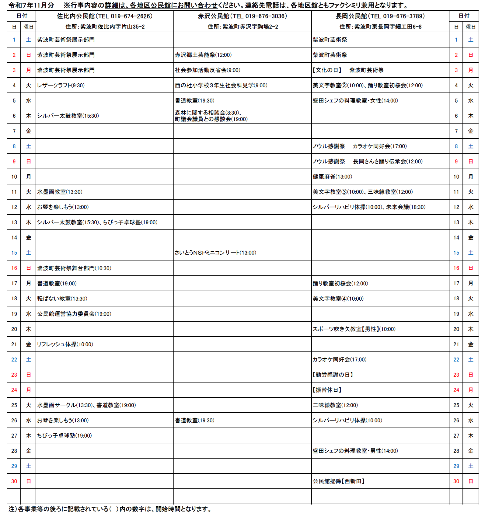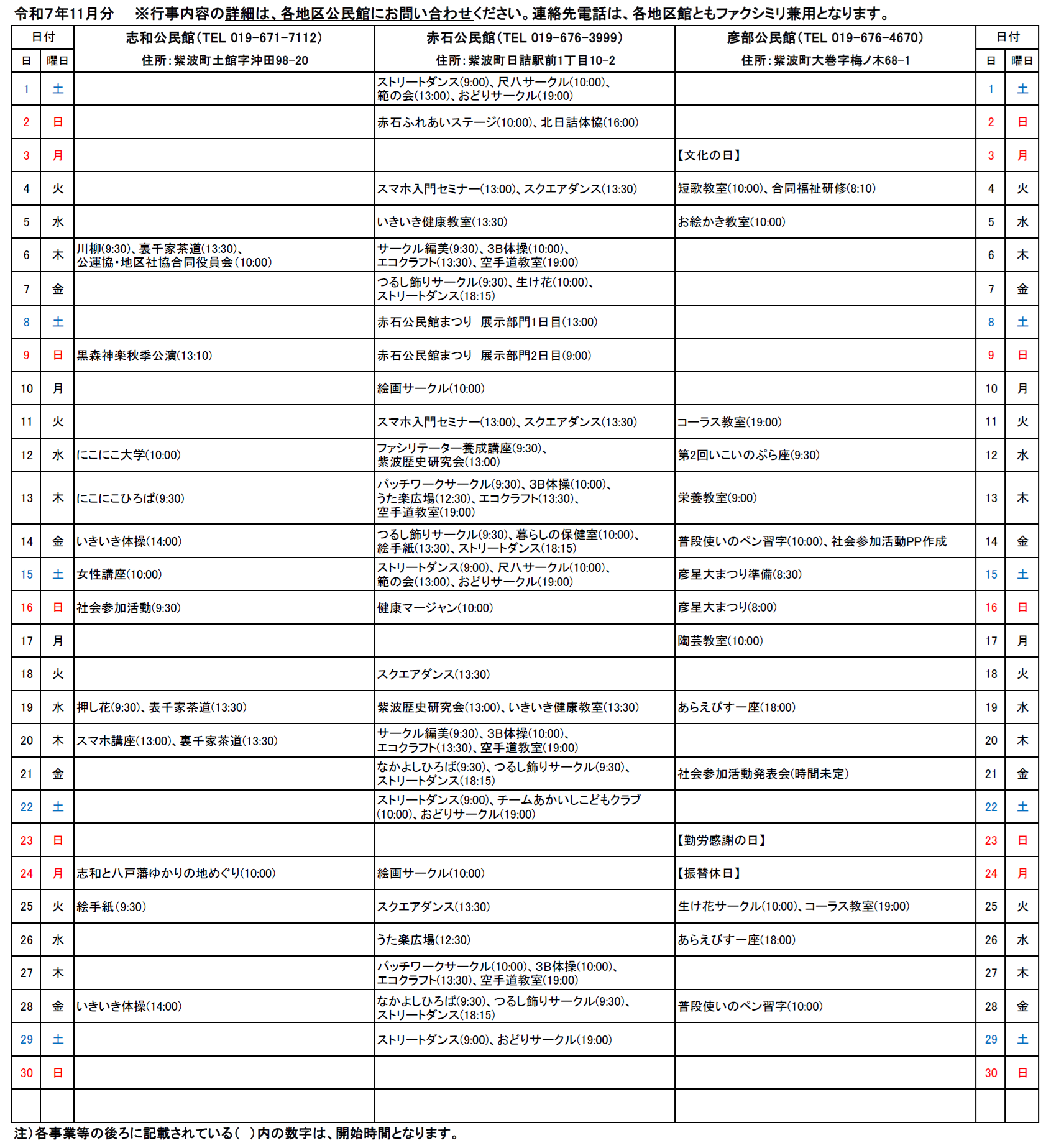 紫波町各地区公民館事業予定(11月分)について