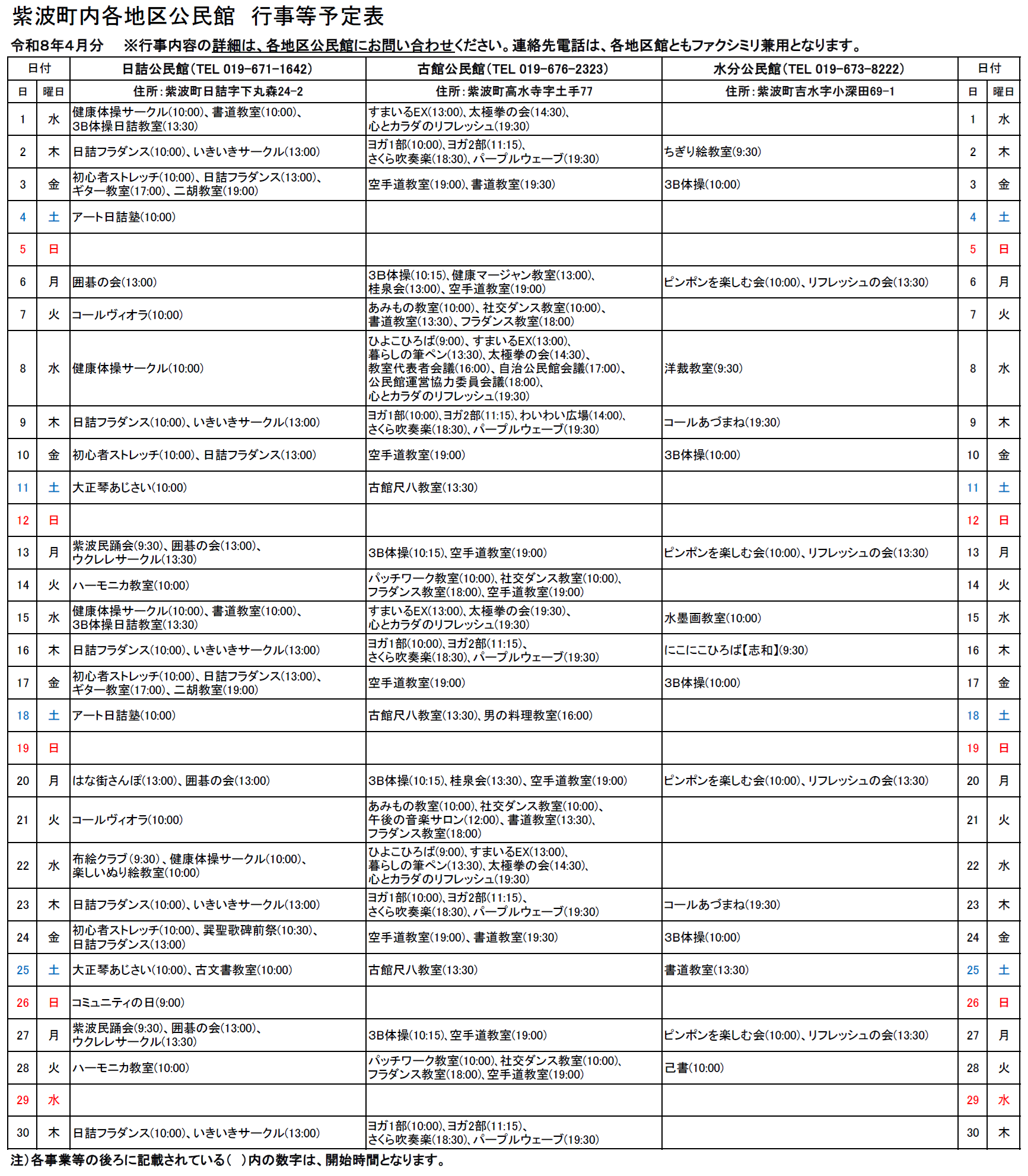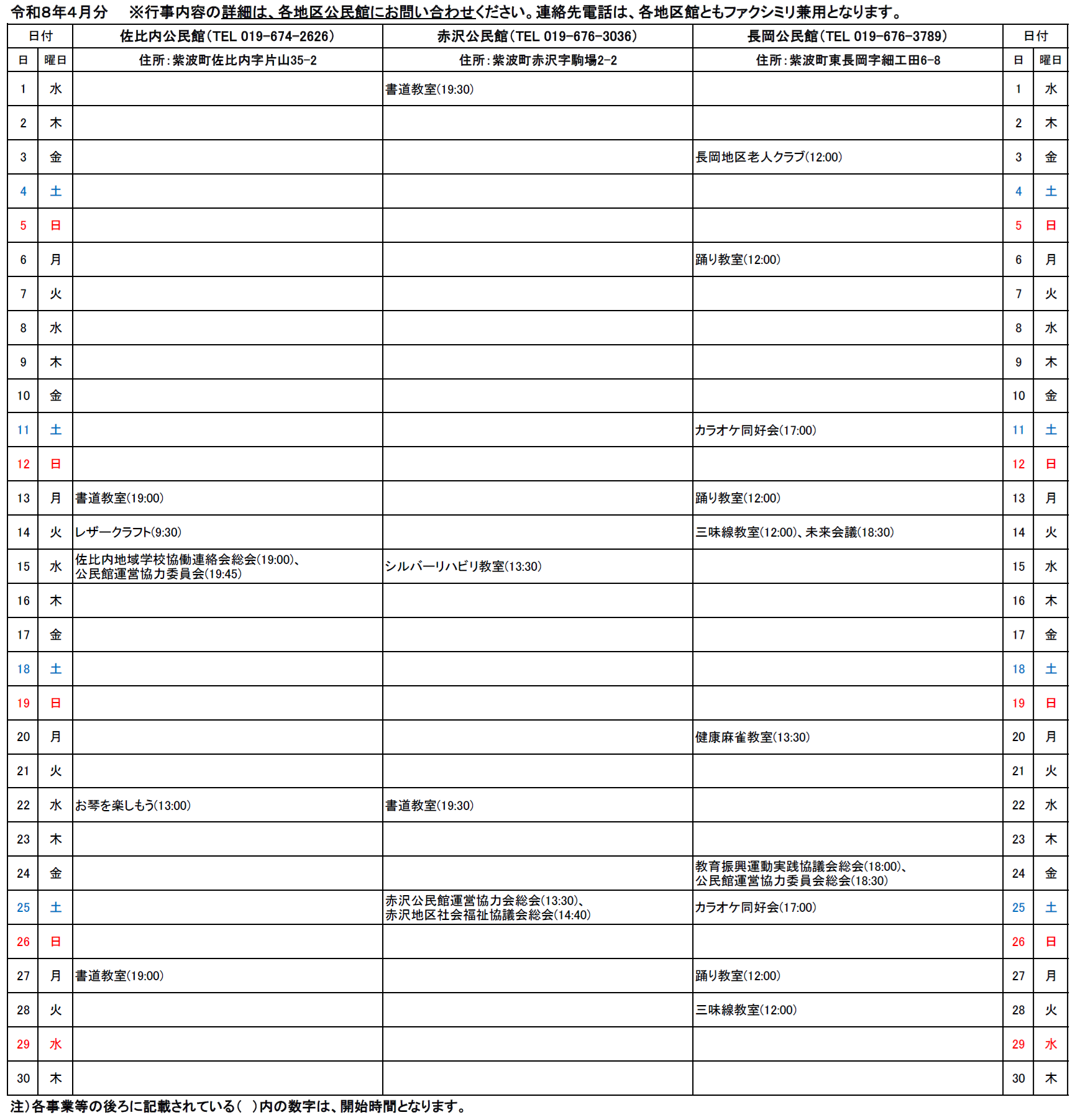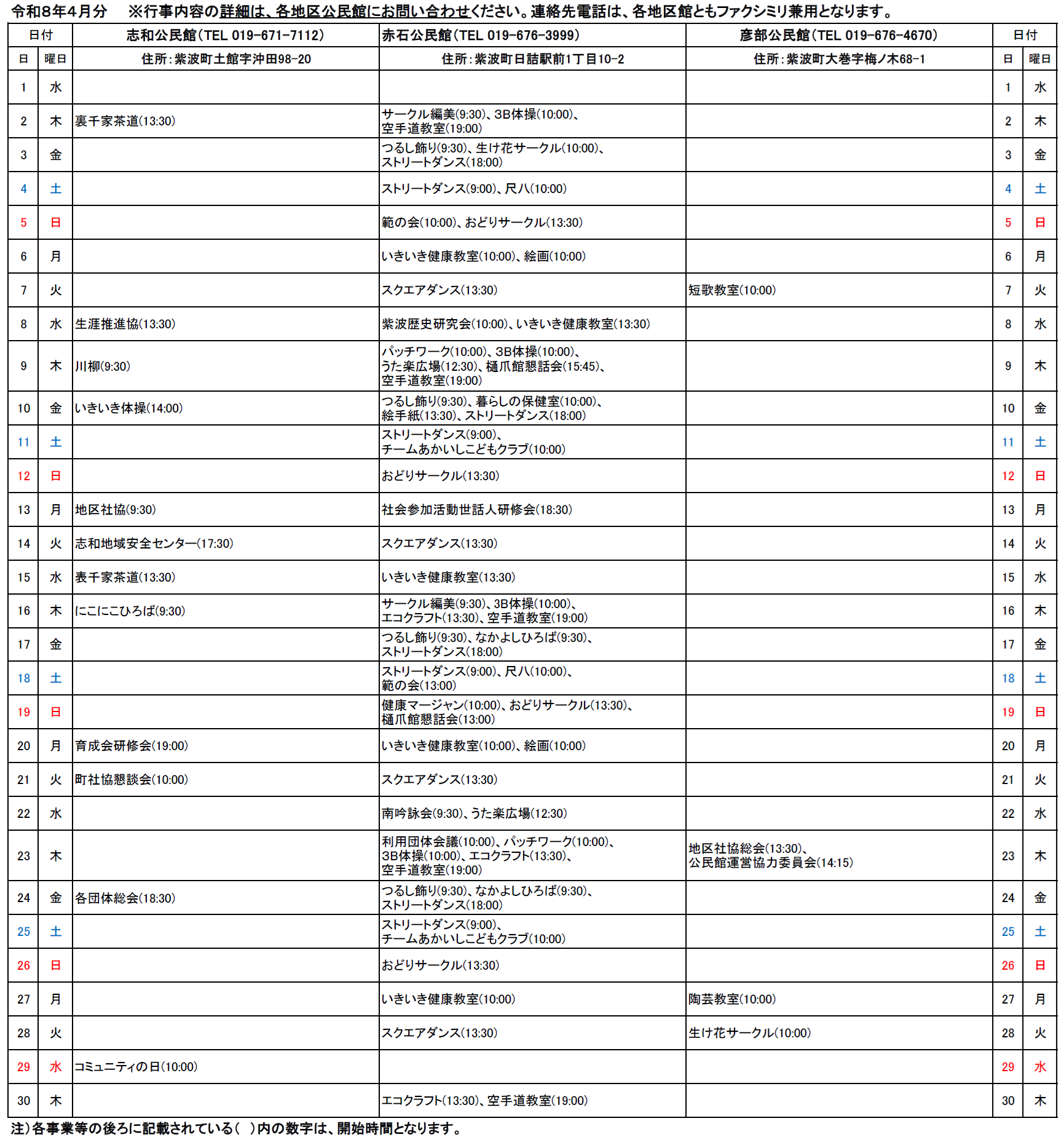 紫波町各地区公民館事業予定(4月分)について